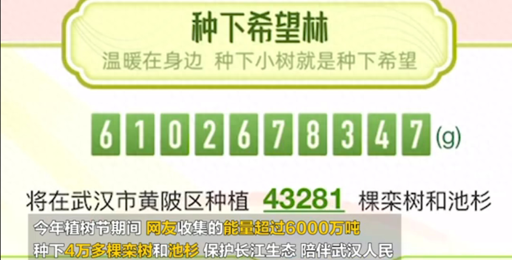 此次“蚂蚁森林互联网植树节”,以“春天,一起种下希望”为题,将所有参与者共同“浇灌”的“希望林”在武汉等地真实种下。截至发稿时间,已有6102678347g水被“浇灌”在“希望林”,预计将在武汉市黄陂区长江边上种下43281棵栾树和池杉。