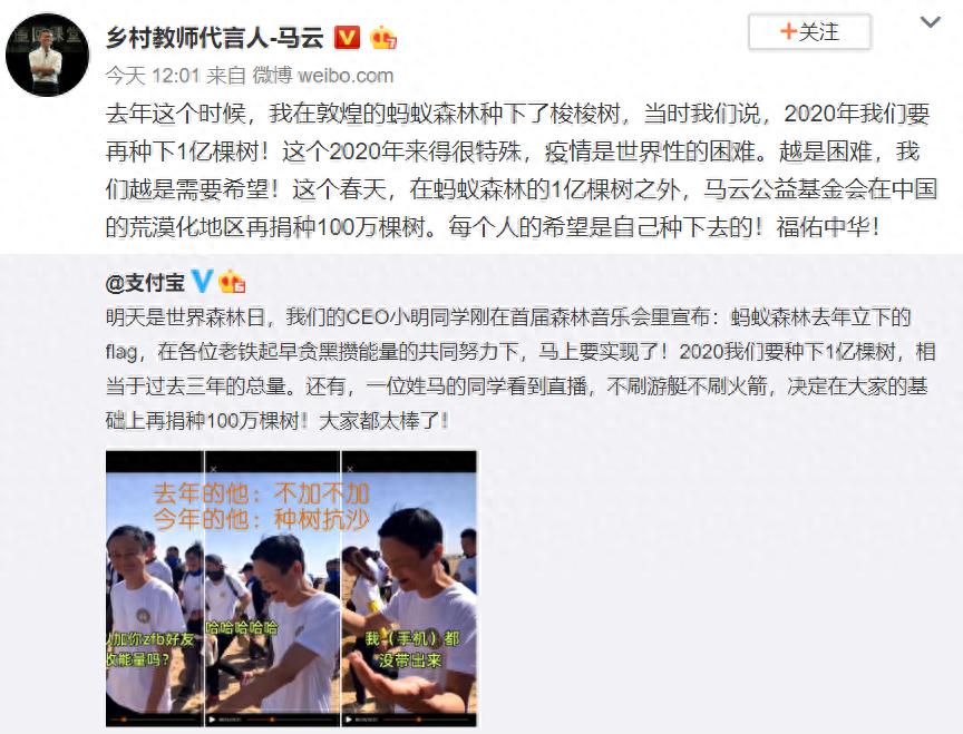 在音乐会结束后第二天,马云马老师更提出会通过马云公益基金会再捐种100万棵树。