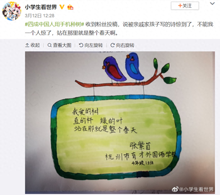 蚂蚁森林最新上线的“春分”主题挂件,配诗《我爱的树》便选自一位4年级小朋友张紫苜的原创作品。