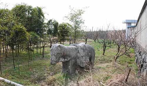 余杭骆家山明墓,位于杭州市余杭区瓶窑镇窑北村骆家山南坡,坐北朝南,已湮。现存石马一对,赑屃一件,均由整块太湖石雕刻而成:石马一对,头相对分列两侧,大小基本相同,高约1.3米、长约2米,腿脚部位均有小部分埋入土中。石马保存完整,整体显得威武强壮,仰首垂尾,鬓毛往两侧披散,马鞍线条较为简单。赑屃,头部残缺,身子近一半埋于土中,龟背纹理清晰,雕刻细致。