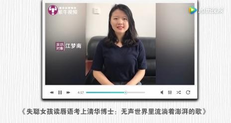 2018年6月《失聪女孩读唇语考上清华博士:无声世界里流淌着澎湃的歌》一文,被人民日报和新华社官微头条推送,全国百余家主流媒体和政务新媒体转发,女孩江梦南从小双耳失聪,却自强不息,通过读唇语在课堂内外刻苦学习,以优异的成绩考上大学、研究生,直至清华大学博士生的故事传遍大江南北,让无数人感动点赞,让大家感受到了坚强的力量。