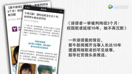 《诽谤者一审被判拘役3个月!校园欺凌延续10年,她不再沉默》,一件诽谤案的背后,紫牛新闻揭开当事人长达10年遭遇网络欺凌的罕见故事,新华社官微头条推送。
