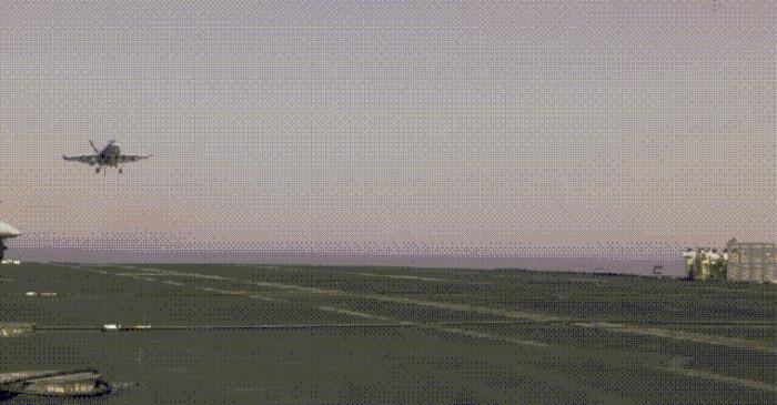 普通战机是减速缓降,而舰载机要求加速降落。这样是为了确保如果没能钩住,舰载机还可以有足够动力马上拉升复飞。动图感受一下。