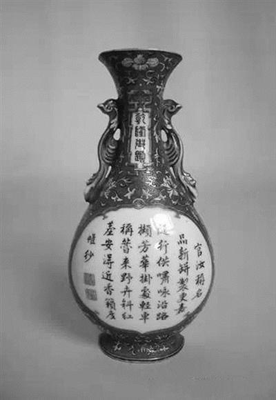 乾隆红地粉彩开光轿瓶。高19.4厘米,口径5.3厘米,底径6.1厘米。造型呈撇口,束颈,圆腹,圈足,颈部有“乾隆御题”四字一行墨彩篆书款。内壁和瓶底施绿松石釉,外壁施胭脂红釉,用轧道技法刻出细密的卷草纹,并绘有粉彩缠枝花卉纹。轿瓶,亦称“壁瓶”或“挂瓶”,是专为悬挂于壁上而设计,靠壁一面平坦,并设有斜孔,以便悬挂,最早出现于明代宣德年间,在万历年间以后逐渐增多。清代继续烧造,在乾隆年间极其盛行,造型规整,器形多样,有莲花、葫芦、瓜棱、胆式等,无论是釉上还是釉下的彩绘,或者是堆塑、镂空、雕刻、贴花等工艺,制作极为讲究。乾隆皇帝在位60年,一生中六下江南、四次东巡,每年秋天还要到承德木兰围场打猎,轿撵是他的主要出行工具,而乾隆皇帝又特别青睐轿瓶,所以命人专门生产了一批轿瓶,悬挂在轿撵内,供其出行时赏玩,“轿瓶”的名称便由此而来。这件乾隆红地粉彩开光轿瓶,制作精美,腹部开光用墨彩书写有乾隆御制诗《咏挂瓶》,“官汝称名品,新瓶制更嘉。随行供啸咏,沿路撷芳华。挂处轻车称,簪来野卉斜。红尘安得近,香籁度帷纱”,这首御制诗写于乾隆八年(1743年)。乾隆八年(1743年),时年33岁的乾隆皇帝第一次东巡,从北京经承德,前往盛京(今沈阳),拜谒祖陵,扩建沈阳故宫,共历时3个月,途中写下了这首御制诗,表现出乾隆皇帝一路轻车骏马、意气风发的天子风范。