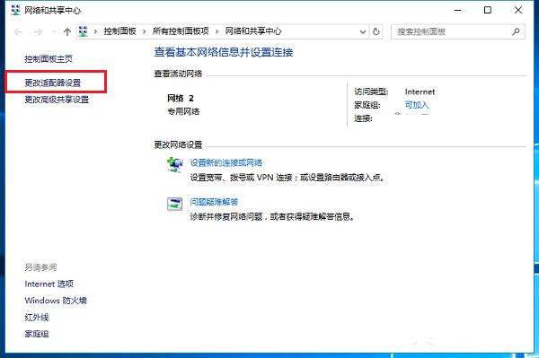鼠标右击任务栏右下角的网络连接图标,选择【打开网络和共享中心】,进入界面,点击【更改适配器设置】,如图,