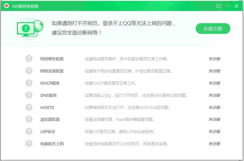 进入界面,点【全面诊断】,开始修复网络,修复完成,重启电脑,即可正常连接网络,