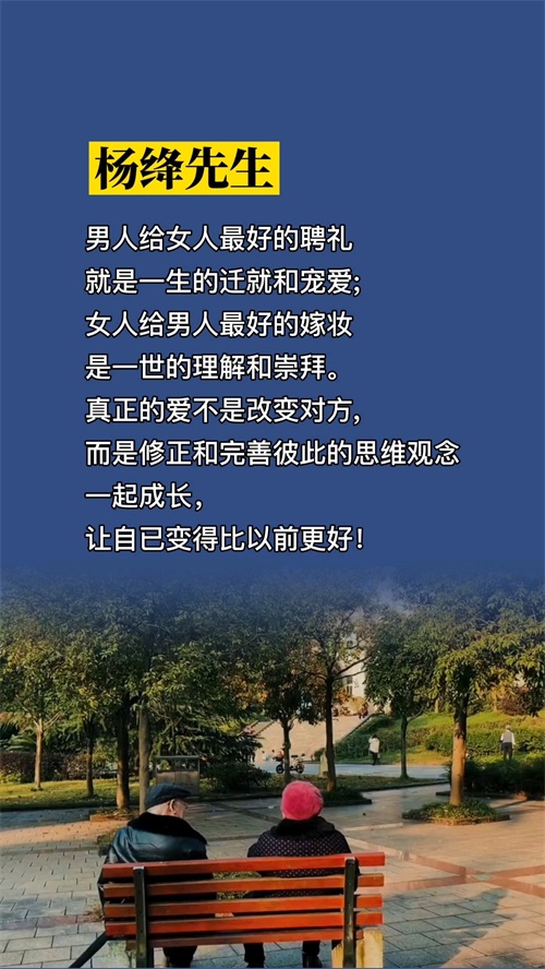 杨绛先生曾经说过:“男人给女人最好的聘礼就是 一生的迁就和宠爱; 女人给男人最好的嫁妆是 一世的理解和崇拜。真正的爱不是改变对方, 而是修正和完善彼此的思维观念”