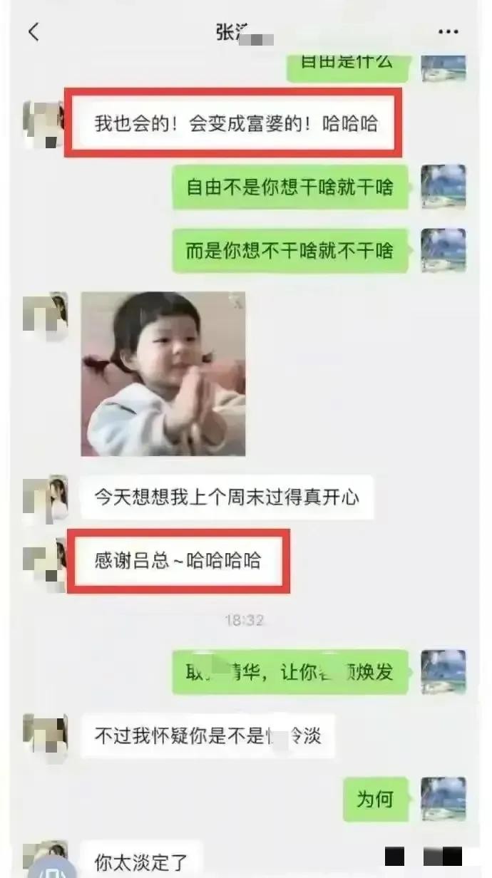 从聊天记录中可以看到,张津瑜的理想就是成为一个富婆,虽然以这种方式成为富婆很丢脸,但是毕竟事情已经发生了,搞得鱼死网破两败俱伤,还不如拿着钱,隐姓埋名,好好享受生活,不再抛头露面就可以了。而对吕总这样的人来说,能够用钱解决的问题都不是问题。