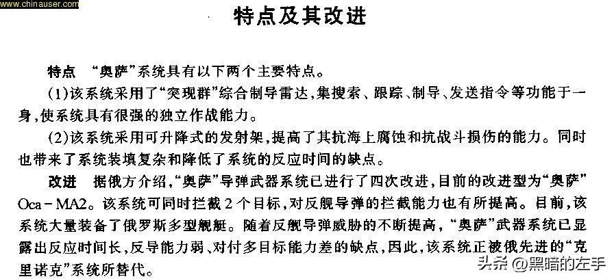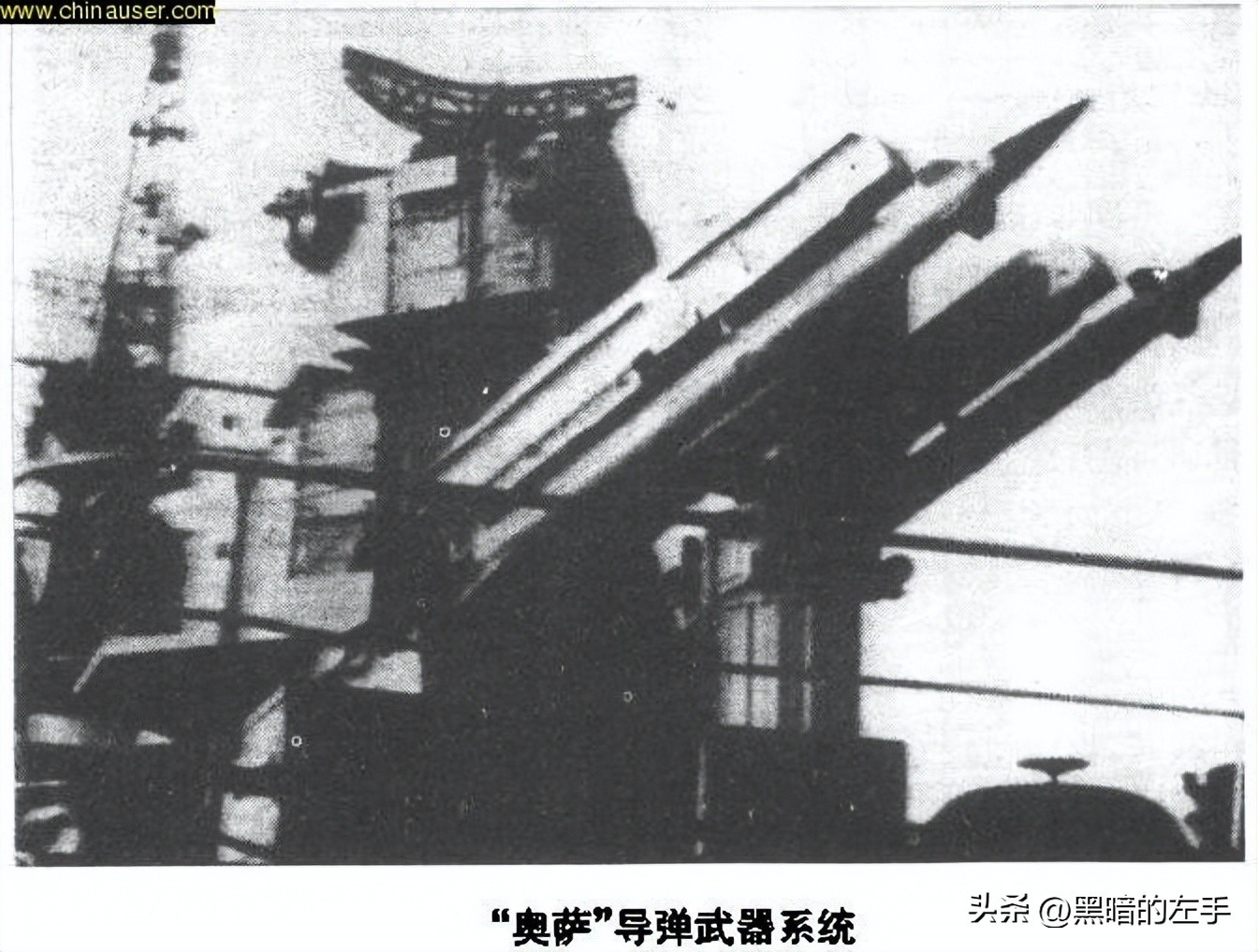 SA-N-4奥萨导弹系统,基本上类似于法国响尾蛇、英国短剑的近程点防御导弹系统。全程指令制导,以地方飞机为主要作战目标。原型来自于陆军的SA-8壁虎。整套系统重量轻,占用甲板面积小,适用于各种轻型作战舰艇。苏俄将其装在各种轻护、扫雷、登陆、辅助船只上,提供一个基础的防空能力。