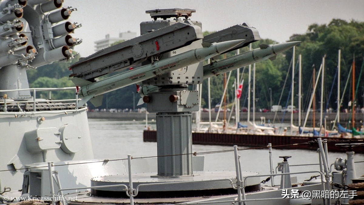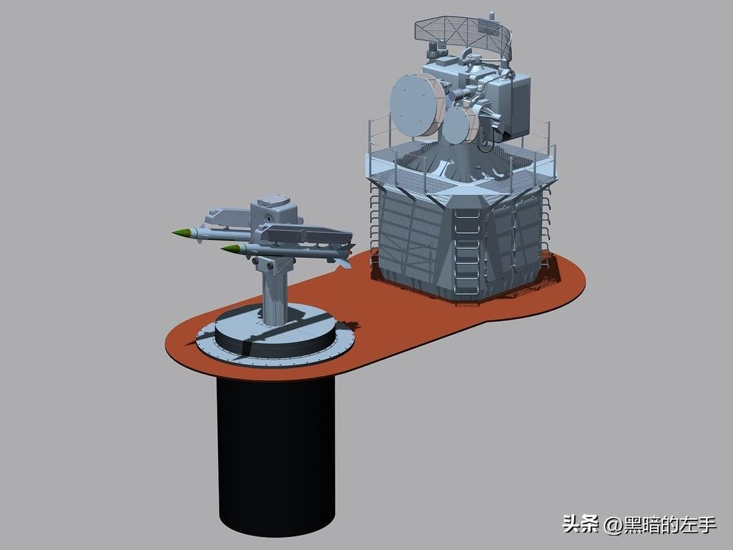 奥萨导弹系统的发射架非常有特色的,平常整体收到甲板下方,作战时升上来。非常的科幻。