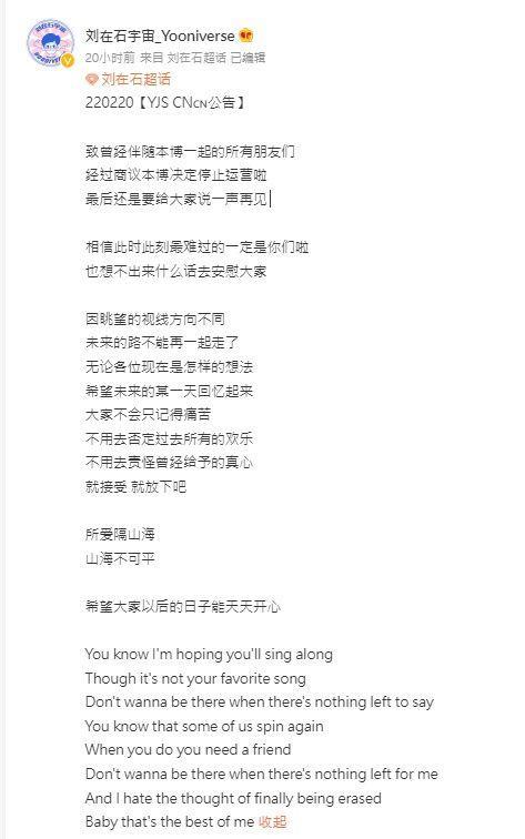 刘在锡51万粉丝团宣布关闭。(图/翻摄自微博)