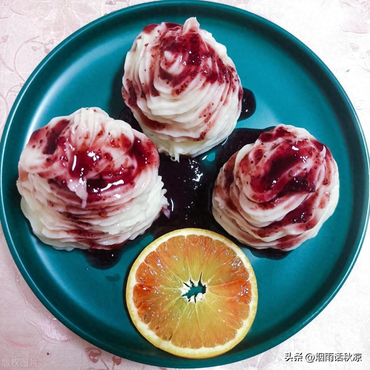 4、蓝莓酱加点温水均匀混合,然后用勺子将混合好的蓝莓酱淋入到做好造型的山药上,美味的蓝莓山药就做好啦。