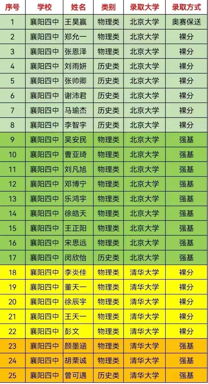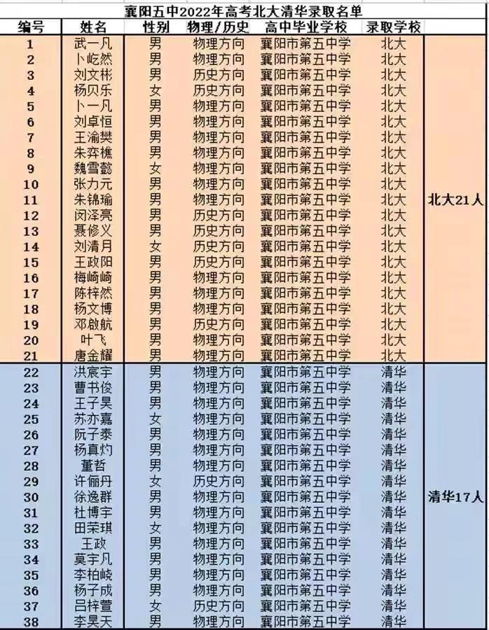 2022高考,襄阳四中25人被清北录取,襄阳五中38人被录取。