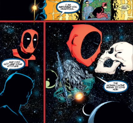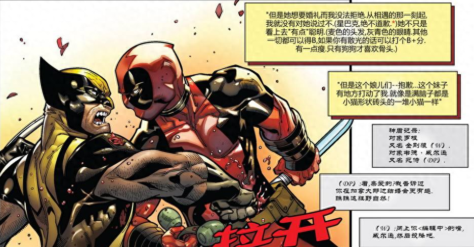 在之前介绍了部分关于灭霸的故事背景之后,不少的粉丝更加期待灭霸和死亡之间的爱情故事。甚至有人更想了解死侍、灭霸、死亡三者之间的三角恋关系。但是看过死侍漫画的朋友都知道,死侍作为一个经常打嘴炮的犯贱反英雄。其漫画画风经常是这样的——