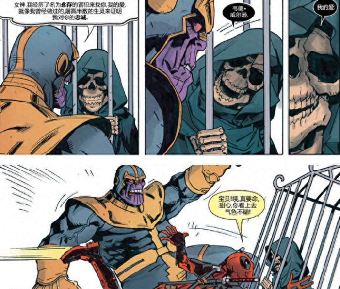 死侍和灭霸两人恩怨的起因是他们同时爱上死亡。《死侍V1》第33期在宇宙的边缘,诸神的乐园中灭霸出场就是手拿一束彗星聚集的花束在死亡女神家前面大喊求婚,