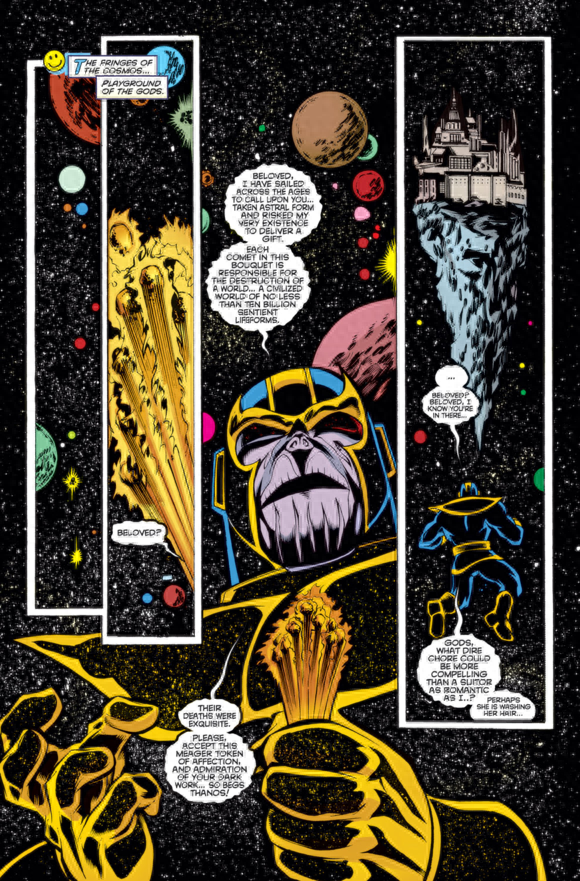 灭霸:“亲爱的,我航行了整个永恒的宇宙呼唤你,见证星球与冒着我的生命为你呈现一个礼物,在这彗星花束里形成的十余万有感知的生命,丝毫不逊色于我为你消灭的那些世界。他们的死亡是精美的,请你接受这份虽然微薄,却表示对你景仰与深情的礼物,所以请你回应我…亲爱的?我知道你在那里!”