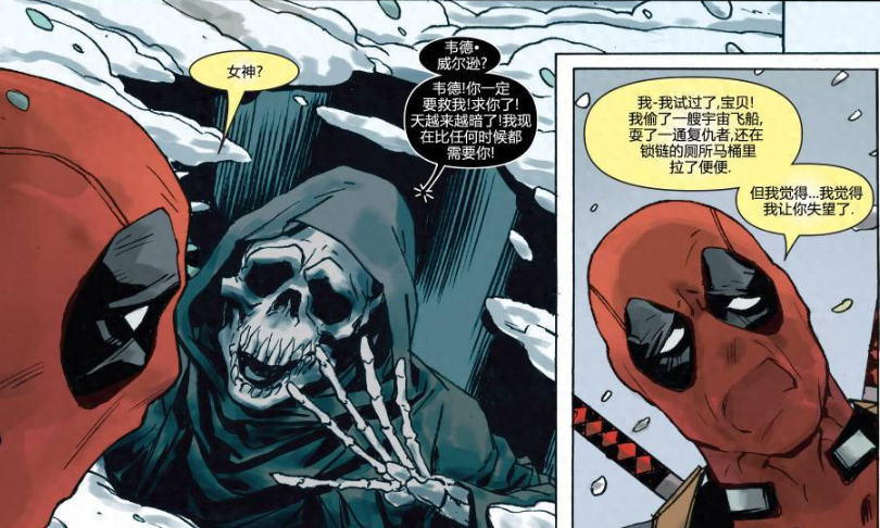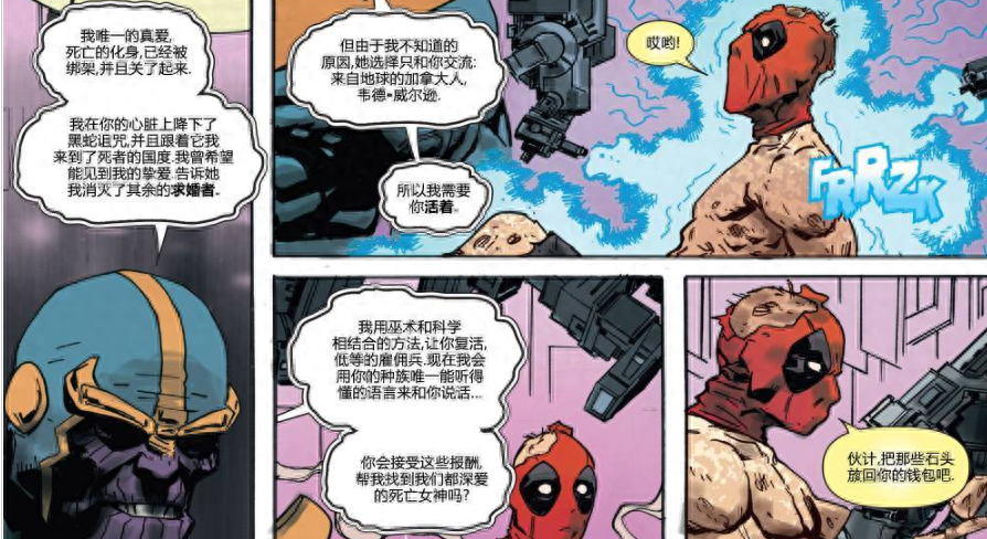 收到死亡求助信息的死侍立即去寻找灭霸,他认为只有二人合作才能救出死亡。(不过死侍的漫画中,文字内容是真的多啊!)