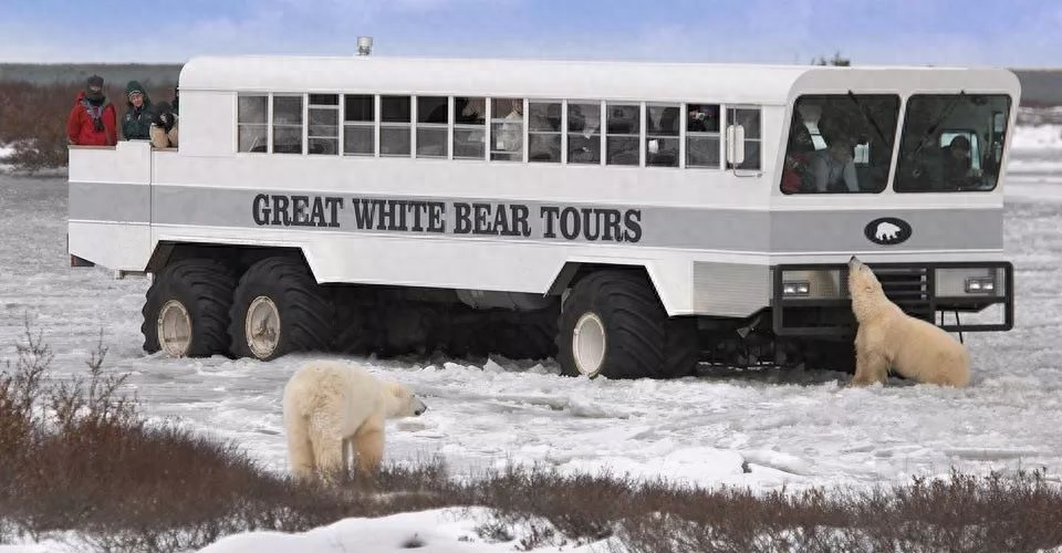 加拿大北部有个丘吉尔镇,被誉为北极熊之村,游客可以坐着特殊的苔原车寻找北极熊。