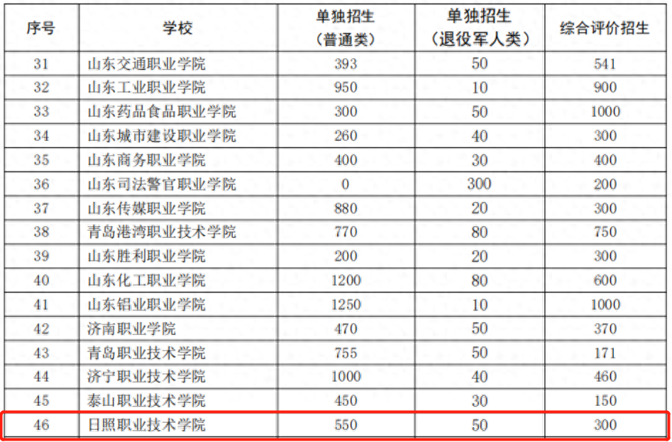 由以上两表数据对比可看出,日照职业技术学院2023年招生总计划为900个,2022年招生总计划为800个。单独招生普通类招生招生计划增加100人,相比去年增长较多;单独招生退役军人类招生计划保持不变;综合评价招生计划不变;