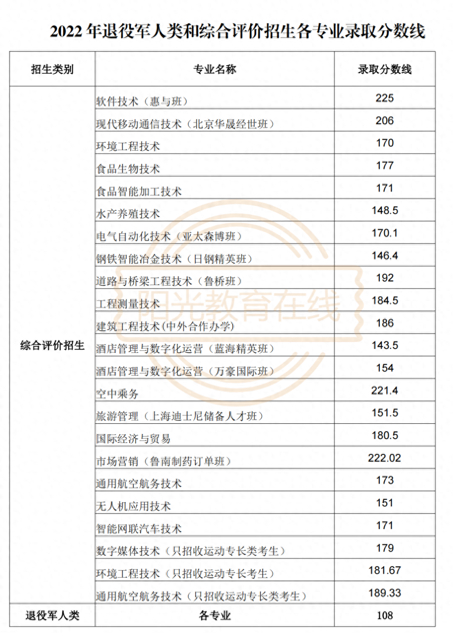 2022年单独招生各专业录取分数线公示