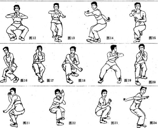 令牌式、鸦雀步、回身式、长手推掌、捻步、翻锤、撩打、肘打、削掌、上山虎、靠打、炮闪、平胸掌收式(图12至图24)。
