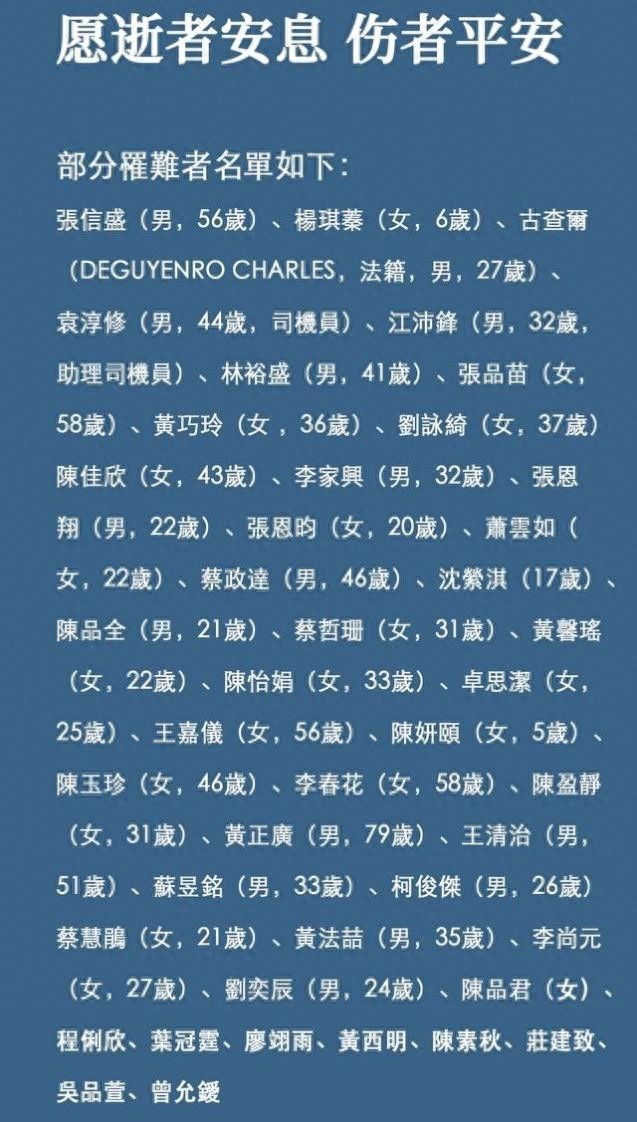 台湾列车脱轨事故部分罹难者名单