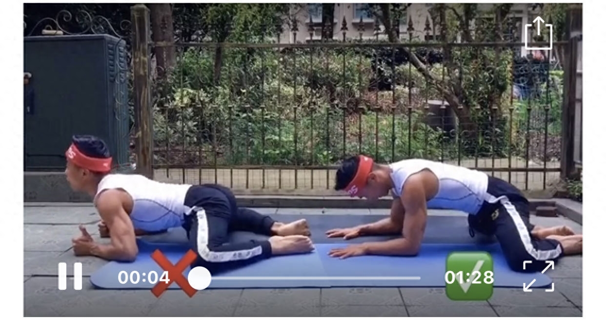 如果是新手,像我这样的,一开始做根本趴不下去,大家可以降低难度,先让四肢着地即可,保持姿势至少一分钟,勤加练习,久而久之,一定能做到髋部触碰到地面。