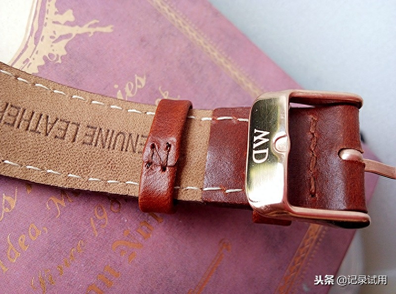 再来看表带部分,有钢印,头层真皮,而表扣我们可以看到是针扣款式,上面也有DW的清晰钢印,和表盘一样是金色,另外走线也非常细腻均匀,表带的另一侧有Daniel Wellington字样的钢印,也非常清晰