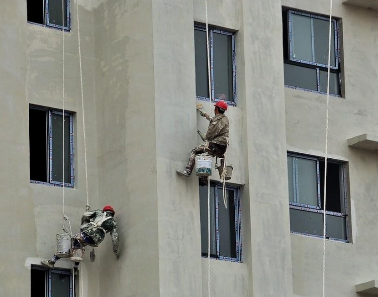 3、工人两腿微弯,两脚用力蹬墙面的同时,双臂伸直,双手微松,两眼注视下方,沿着安全绳慢慢下滑。