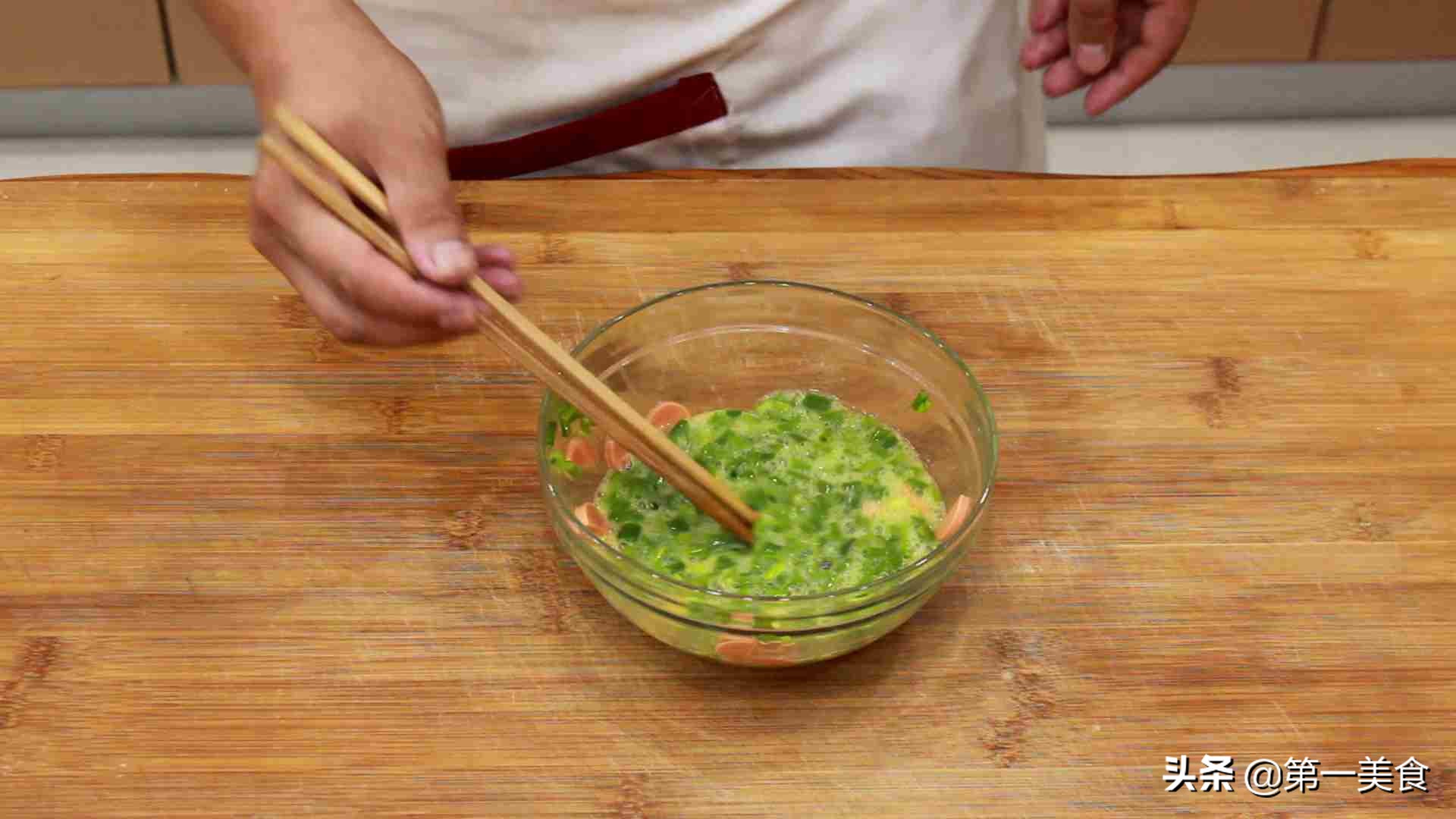 1.首先,我们在碗中打入三个鸡蛋,洗净的小葱一把,切成葱花,火腿一根切成薄片,和鸡蛋放在一起,加入食盐2克,搅拌均匀备用。