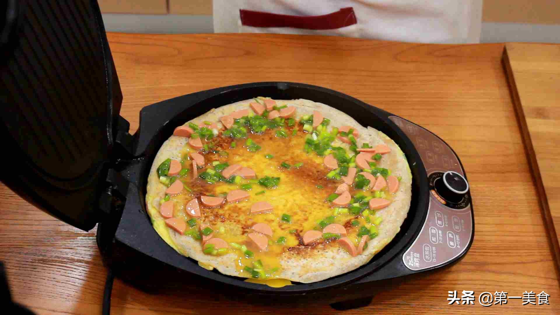 4.2分钟以后,面糊已经基本定型,我们把调好的蛋液,均匀的淋在上面,盖上锅盖再烙1分钟,烙至蛋液全部定型,我们把它翻过来。