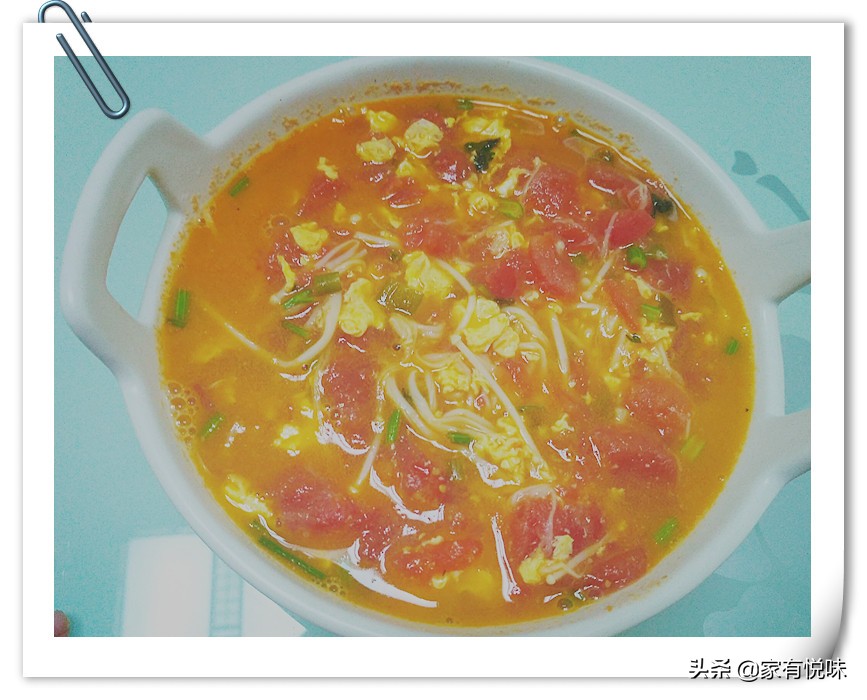 8、 这样酸甜适口,营养丰富,开胃好喝的西红柿金针菇鸡蛋汤就做好了,一起喝起来吧。
