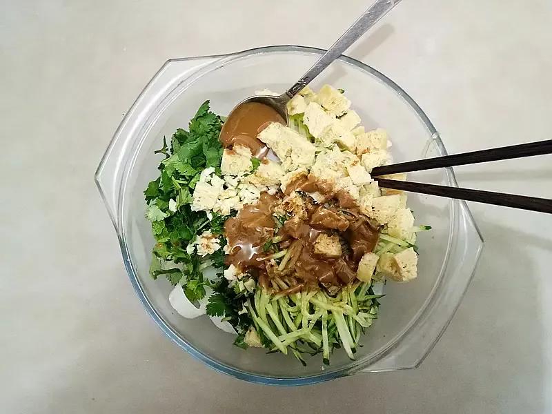 2.这时我们把新摘来的黄瓜洗干净切丝。香菜洗净切末,蒜瓣剥皮砸成汁,芝麻酱倒入少量清水至,慢慢搅拌均匀在逐渐加水搅拌均匀至自己满意即可。(千万不要一次加足)