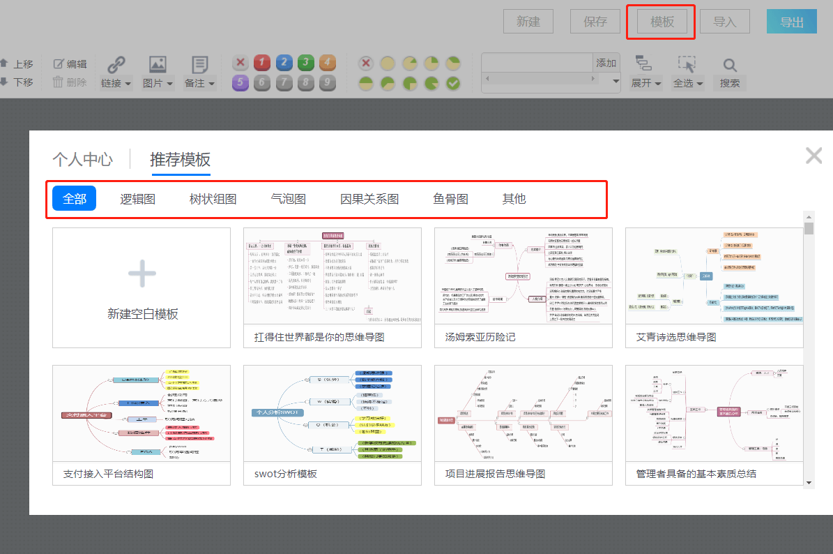 另外,如果你想要更省力的制作思维导图的话,可以点击其中的【模板】,在里面查找相关的思维导图模板进行套用。里面的模板是真的多,而且涉及的种类也比较齐全,有逻辑图、树状组图、气泡图、因果关系图等等。