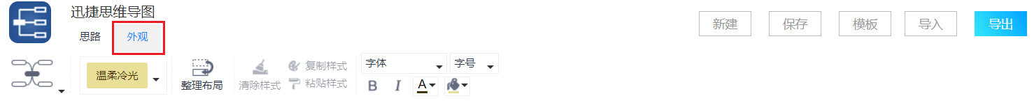 顶部是菜单栏,菜单栏里有很多功能,主要有两大块,分别是思路和外观。可以直接在里面选择对应的功能选项进行添加使用。