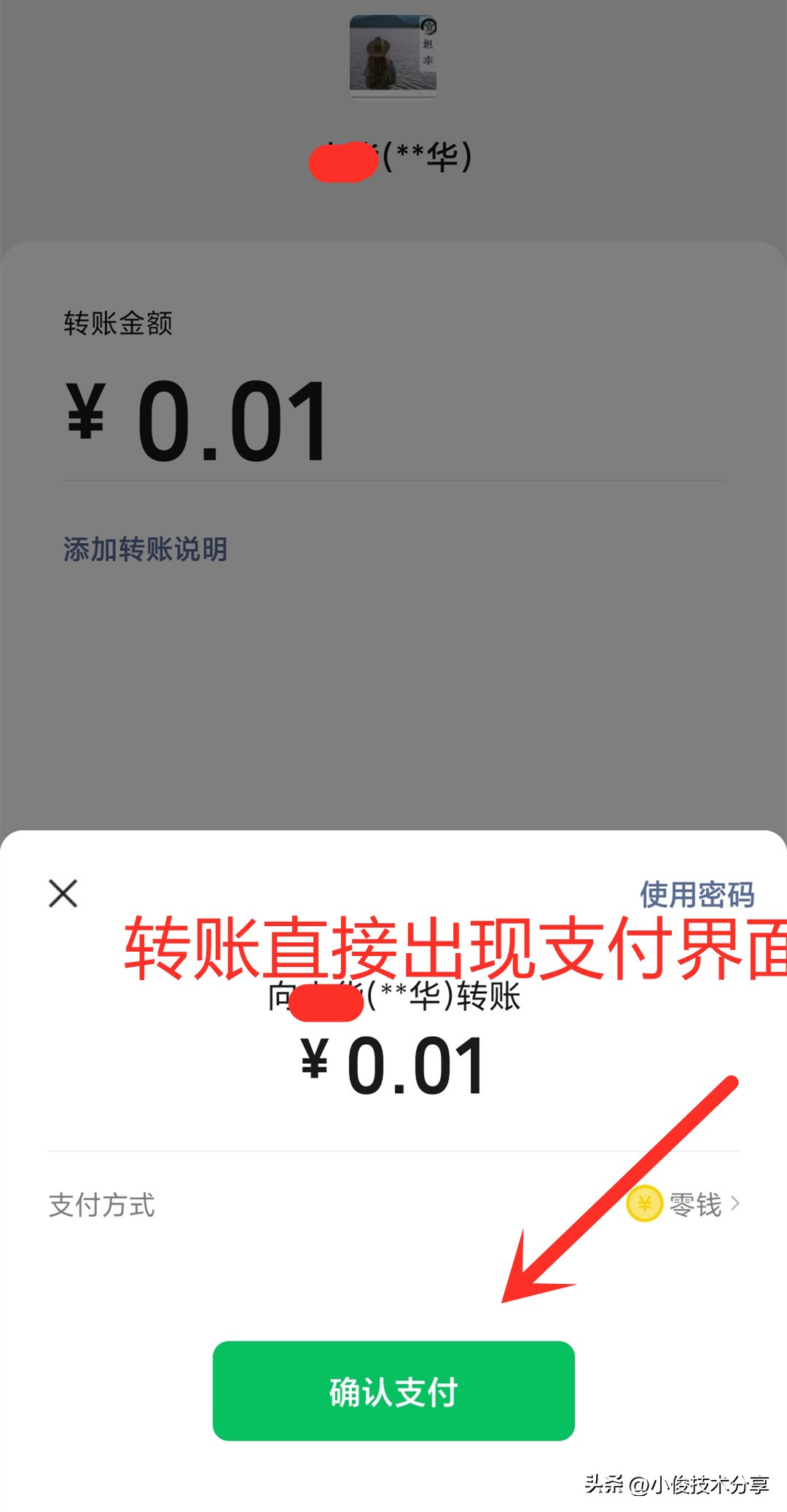 不仅如此,我们在转账里面输入1分钱之后,然后点击转账,这个时候呢,就会出现让我们输入密码,那么我们就不要输入密码了,因为此时已经说明对方没有把我们删除了,如果已经把我们拉黑或者删除了的话,是不会出现输入密码界面的,而是直接出现我们不是收款方好友的界面!
