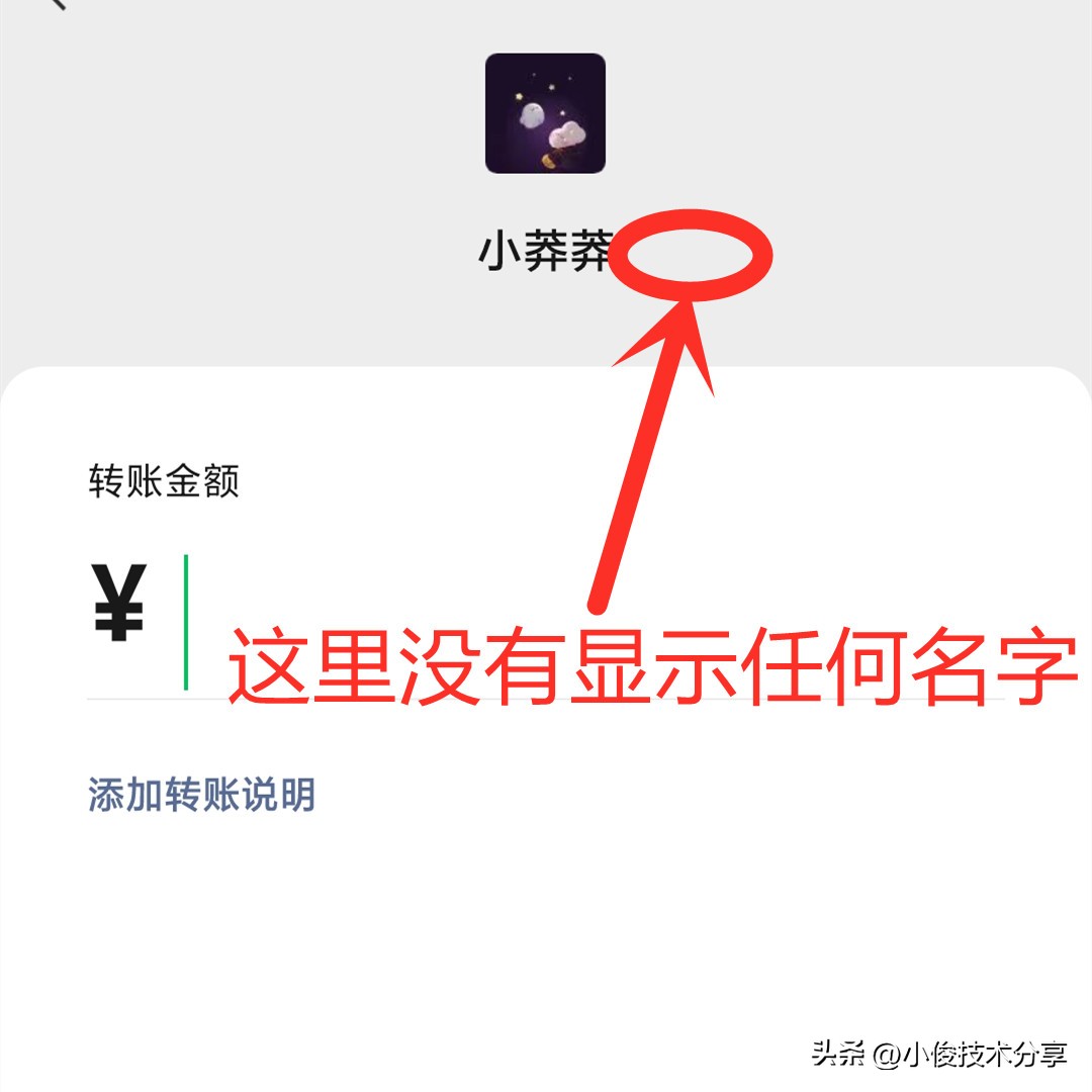 接着就会出现转账页面,那么这个时候我们注意观察,我们看上面的微信名称后面有没有显示对方的名字,如果没有,那么这个好友就可能已经把你删除或者拉黑了,此时我们还不能马上得出结论,因为有些没有实名的好友这里也不会显示名字