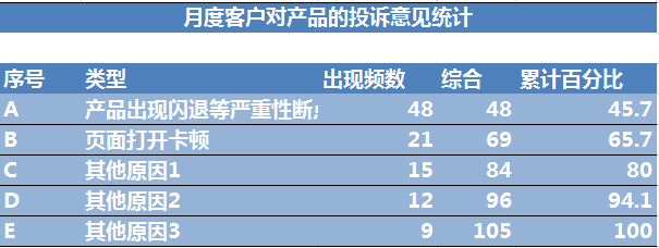 柏拉图是一种条形图,条的长度代表事件发生的频率或成本,通过柏拉图可以直观的看到哪些情况是比较重要的。例如,产品经理在月末整理本周产品被投诉的客户意见的时候,可以将投诉声音归类,用柏拉图表示出来。