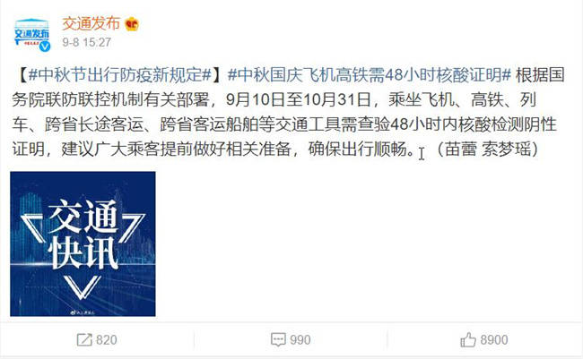 根据国务院联防联控机构提出方案,国庆假期9月10日至10月31日期间乘坐飞机、高铁、跨省长途客运、跨省客运船舶、列车等交通工具需要提供48小时内核算检测阴性证明,有出行需求的朋友们注意提前做好准备,保障顺利出行。