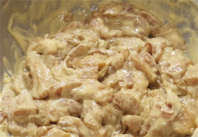 让我们提前腌制好的猪腿肉放入面糊中抓拌均匀,让每一个肉片都均匀的裹上面糊。